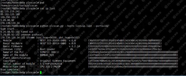 備注:也可以通過輸入python plcscan.py 178.139.130.34 –ports=102 進(jìn)行指定ip掃描,如下圖所示