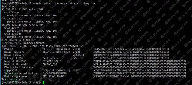 備注:也可以通過輸入python plcscan.py 178.139.130.34 –ports=502 進(jìn)行指定ip掃描,如下圖所示