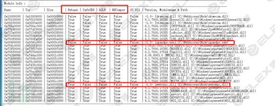 可見EIP被精確劫持。那么再下一步,即可繼續根據堆棧情況設計布局shellcode了,對于shellcode編寫一個更有利的消息便是WebAccess軟件的模塊代碼編寫中幾乎未啟用Windows系統的相關安全機制,如ASLR、DEP: