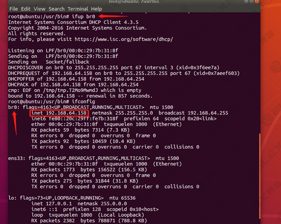 Qemu運行之前先啟動橋接網絡,在本地ubuntu命令行終端執行以下命令(注意:ens33為ubuntu默認網卡):