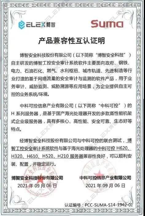 近日,博智安全科技股份有限公司(以下簡稱“博智安全”)與中科可控信息產業有限公司(以下簡稱“中科可控”)完成產品兼容性互認證。經雙方聯合測試得出:博智工控安全審計系統軟件與基于海光處理器的中科可控H620、H320、H610、H520、H210服務器兼容性良好,系統功能穩定運行且表現優異,能夠充分滿足企業級用戶應用需求,并出具產品兼容性證明。
