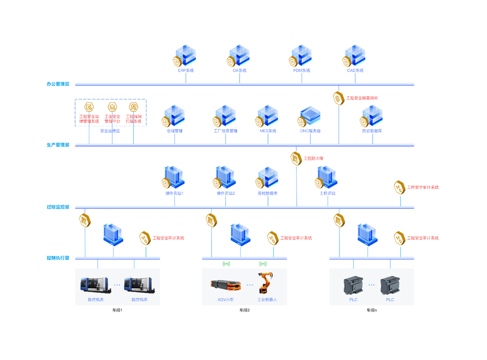 | 采集智能工廠部署的安全設備產生的安全數據,經匯聚后通過機器學習、威脅情報、關聯分析等手段發現各種網絡攻擊行為、用戶異常訪問和操作行為,將安全分析結果進行可視化展示。 | 通過建立完善的終端安全防護體系,包含防病毒、身份鑒別、外設管控,確保智能生產過程主機的安全性,防止外部和內部的非法操作,做到主機安全的有效防御。 | 按照智能設計、智能生產、智能管理不同功能特點劃分安全域,重點解決不同區域內的隔離和數據交換的控制。對內部用戶非授權聯到外部網絡的行為進行檢查或限制,優化邊界防護。 | 對監控層到控制層、控制層到操作層的指令建立數據完整性審計功能,保障傳輸指令過程中不被修改,確保執行命令的真實性、準確性。 |